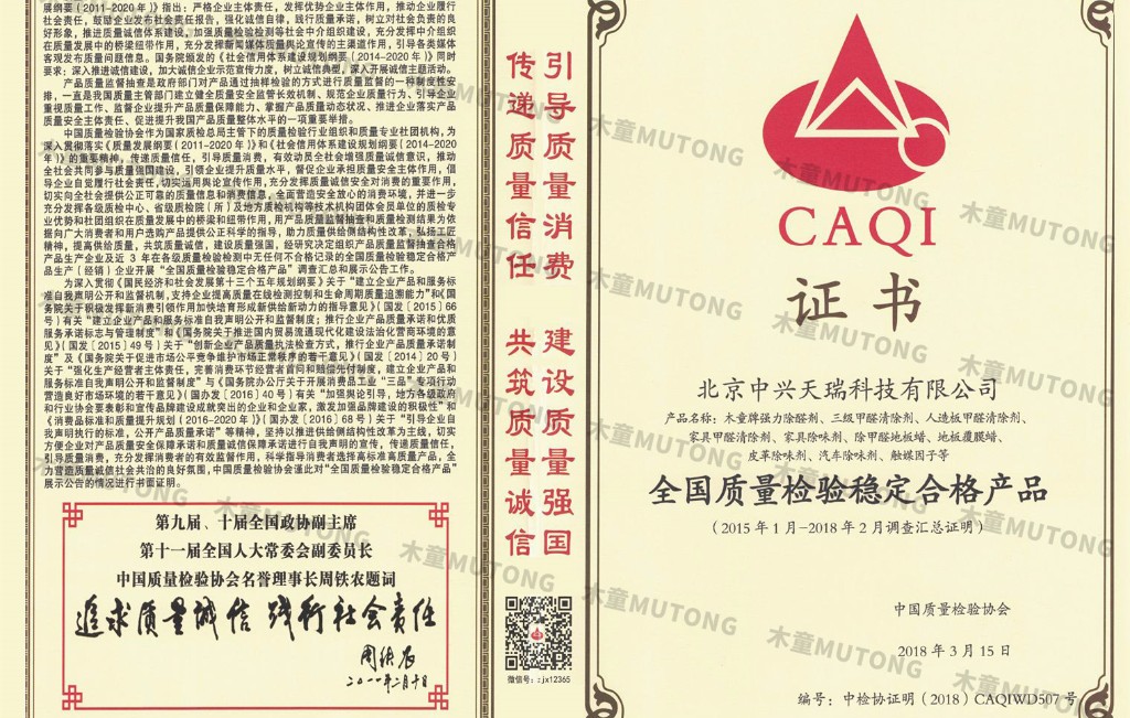 木童除甲醛產品榮獲2018年全國質量信得過產品稱號